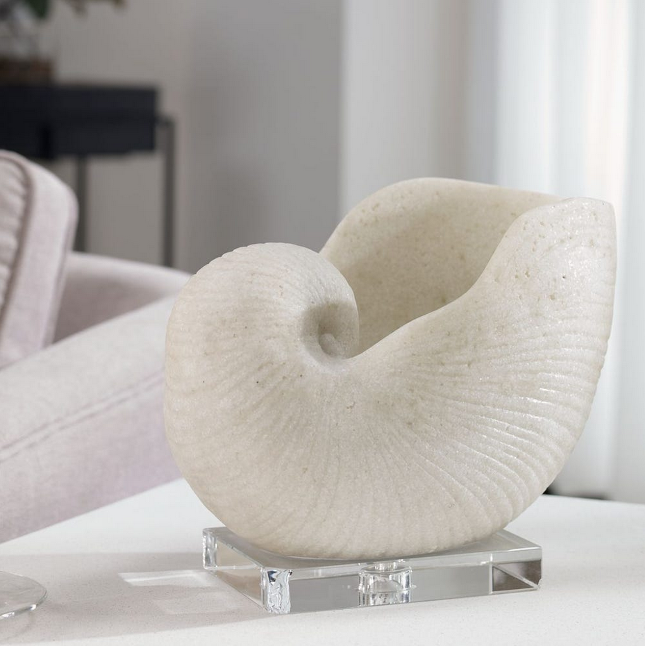 An oversized nautilus shell, crafted from ivory man-made stone that accurately replicates the look of Thassos marble and set on a crystal base.