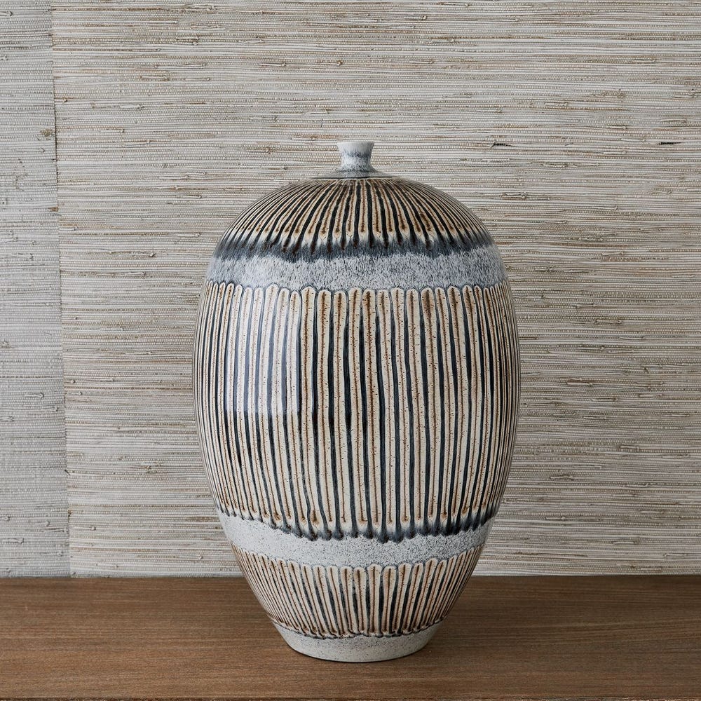 Elegant shape is hand decorated expressing a look reminiscent of studio pottery of the 1960’s. The unique pattern is hand drawn using a combination of crayon and glaze by European artisans. Each piece is singular and will have variation in pattern and tone ensuring yours is unique.